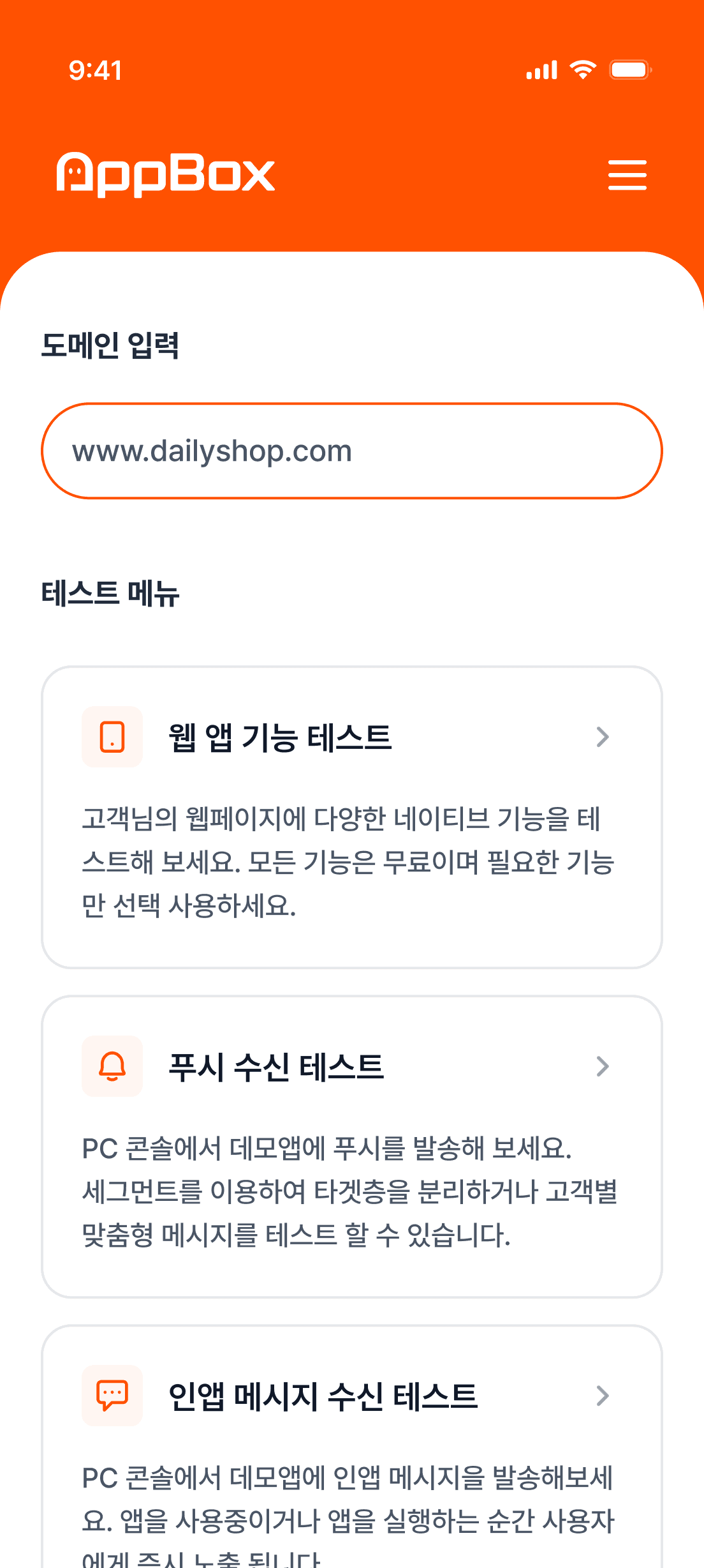 설치된 앱으로 푸시와 인앱 메시지를 직접 테스트할 수 있습니다 스토어 출시 전에 필요한 기능을 미리 확인할 수 있습니다