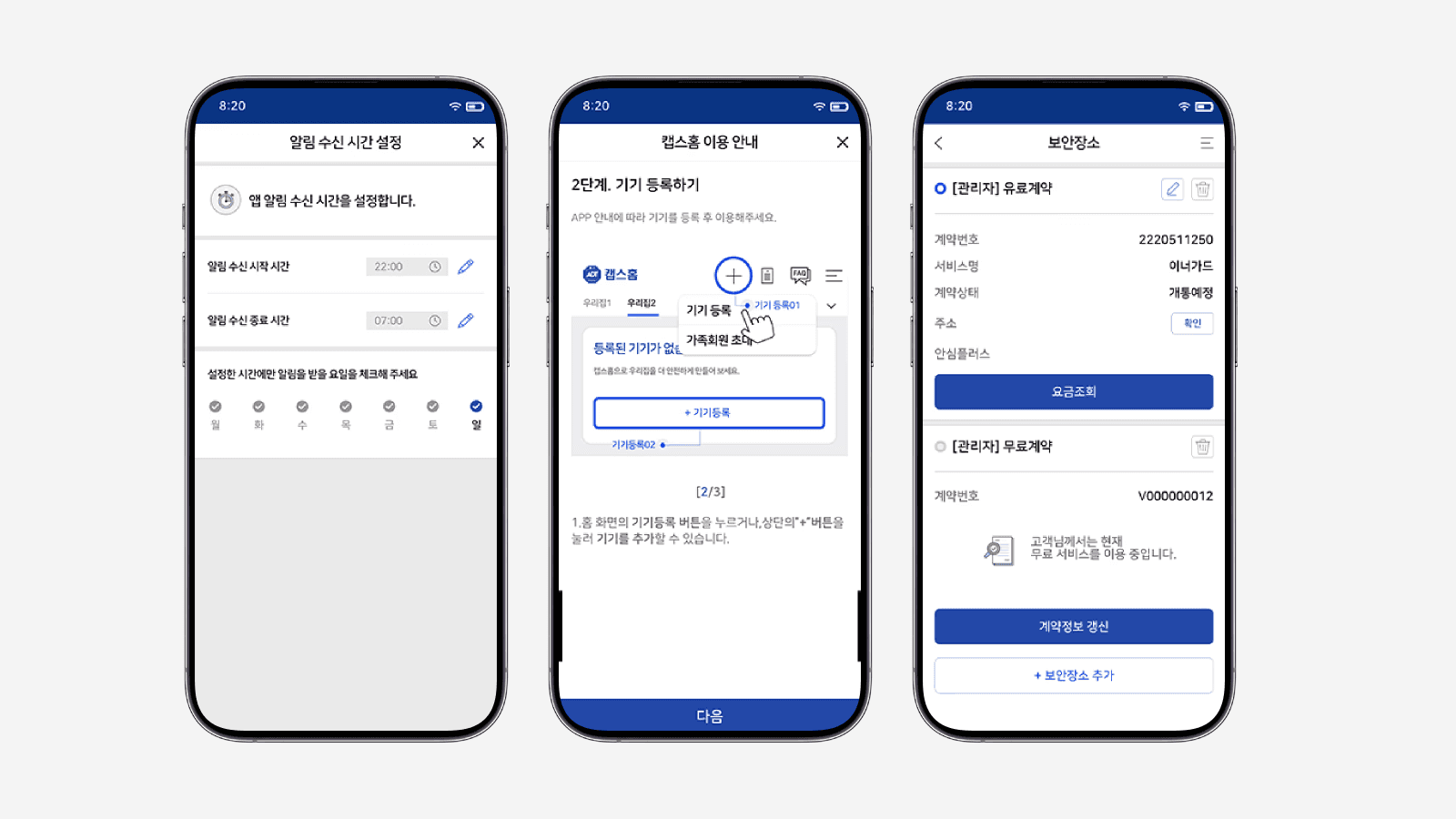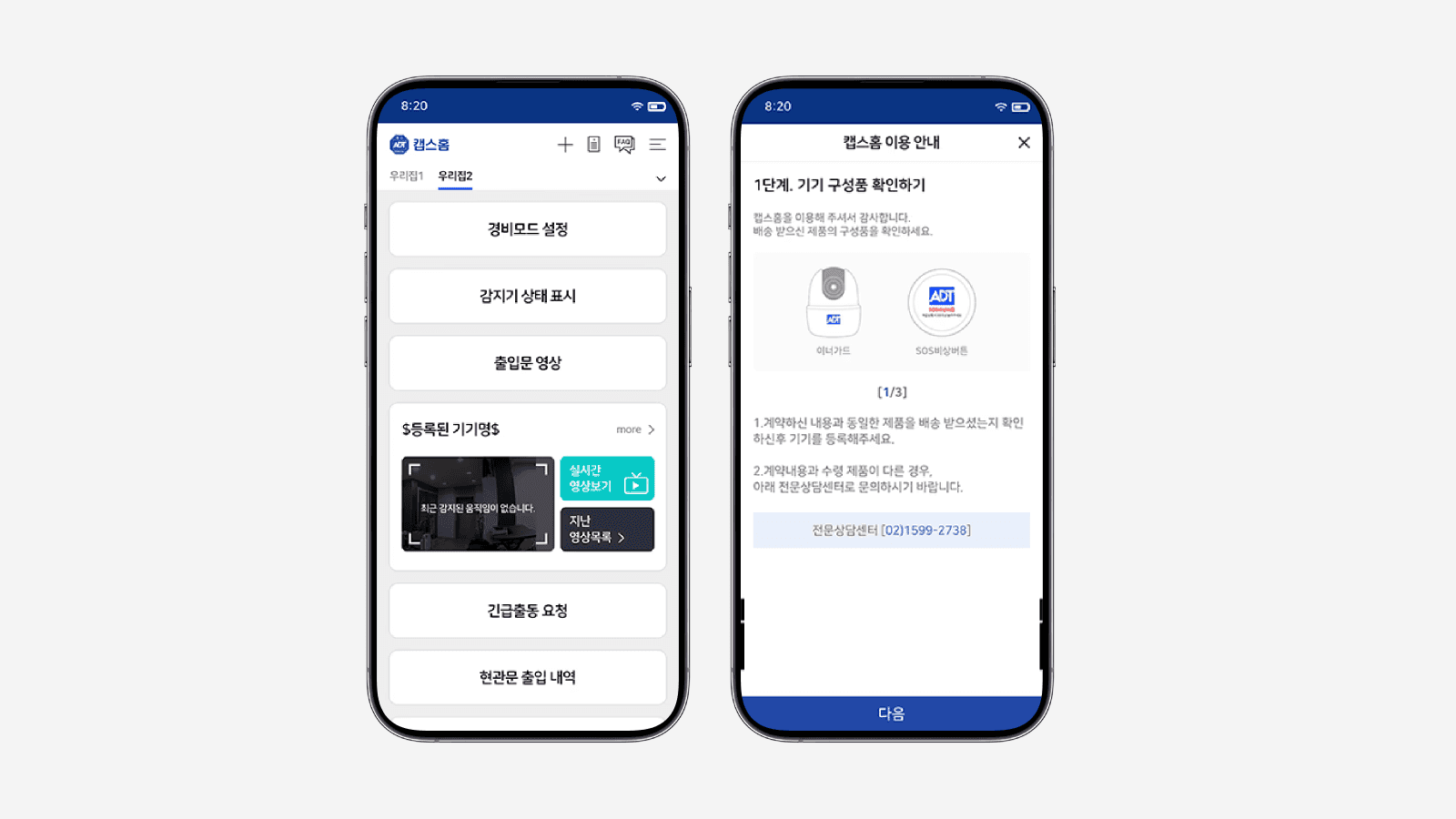 캡스홈 도어가드 주요 기능 현관 앞 움직임 즉시 촬영, AI 얼굴인식 기능 포함, 현관 앞 움직임 즉시 촬영 및 양방향 대화 현관 앞 움직임을 실시간으로 감지하고 Full HD 고해상도 영상으로 촬영하여 앱으로 알림을 제공하며, 야간에도 선명하게 확인 가능합니다. 양방향 대화 기능, 직장이나 여행지 등 언제 어디서나 방문자와 대화할 수 있으며, 대화가 불편할 경우 안내 음성(남성 목소리)을 선택하여 송출할 수 있습니다. 현관 입/출입 관리, 현관문 앞 실시간 움직임 촬영뿐만 아니라, 가족의 외출 현황 등 입/출입 기록을 앱으로 확인할 수 있습니다. 녹화 영상 재생 기능 실시간 영상 (WebRTC 방식) 제공 및 클라우드 녹화영상 (Mp4 다운로드 방식) 기능이 구현되어 있습니다. 복수 카메라 등록 시 홈 화면에서 카메라 변경 선택을 위한 'Bottom sheet' 기능이 기획되었습니다. 가족 회원 초대 메뉴를 홈 화면에 추가할 수 있습니다. 얼굴 인식/등록 기능 (얼굴 등록 오류 개선 작업 진행). 화면 녹화 기능: 화면을 녹화하고 녹화된 영상의 얼굴을 마스킹 처리 하는 기능을 개발 하였습니다. 공통 및 기타 앱 기능 긴급 출동 요청: 위급 상황 시 또는 실시간 영상 확인 중 불안함을 느낄 때 '출동요청' 버튼을 눌러 가장 가까운 ADT캡스 출동대원의 긴급 출동 지원을 받을 수 있습니다. 위치 조회 서비스 (위치공유): 가족 회원을 초대한 후 가족 회원의 위치를 표시하는 데 사용됩니다. 안심존 설정 : 안심존 설정 시 가족이 위치에 반경에 진입하거나, 이탈 하였을때 푸시 안내 메시지가 실시간 발송됩니다. 기타 앱 기능: 보이는 ARS: 내부 SDK 연동, 통합 아이디 로그인 연동 모바일가드 연동 기능: 모바일가드 서비스 종료에 따라 연동 기능이 종료되었습니다. 택배 배송조회 기능: 11번가 택배 배송조회/보상 서비스 종료에 따라 기능이 제거되었습니다.