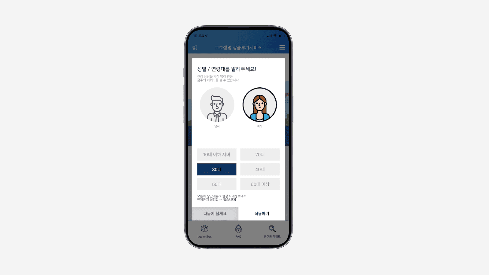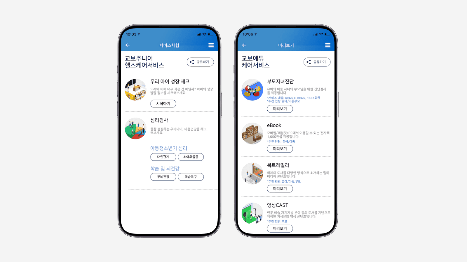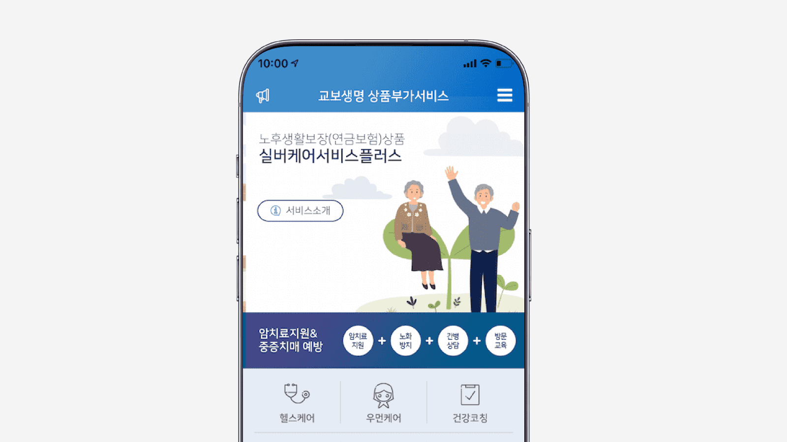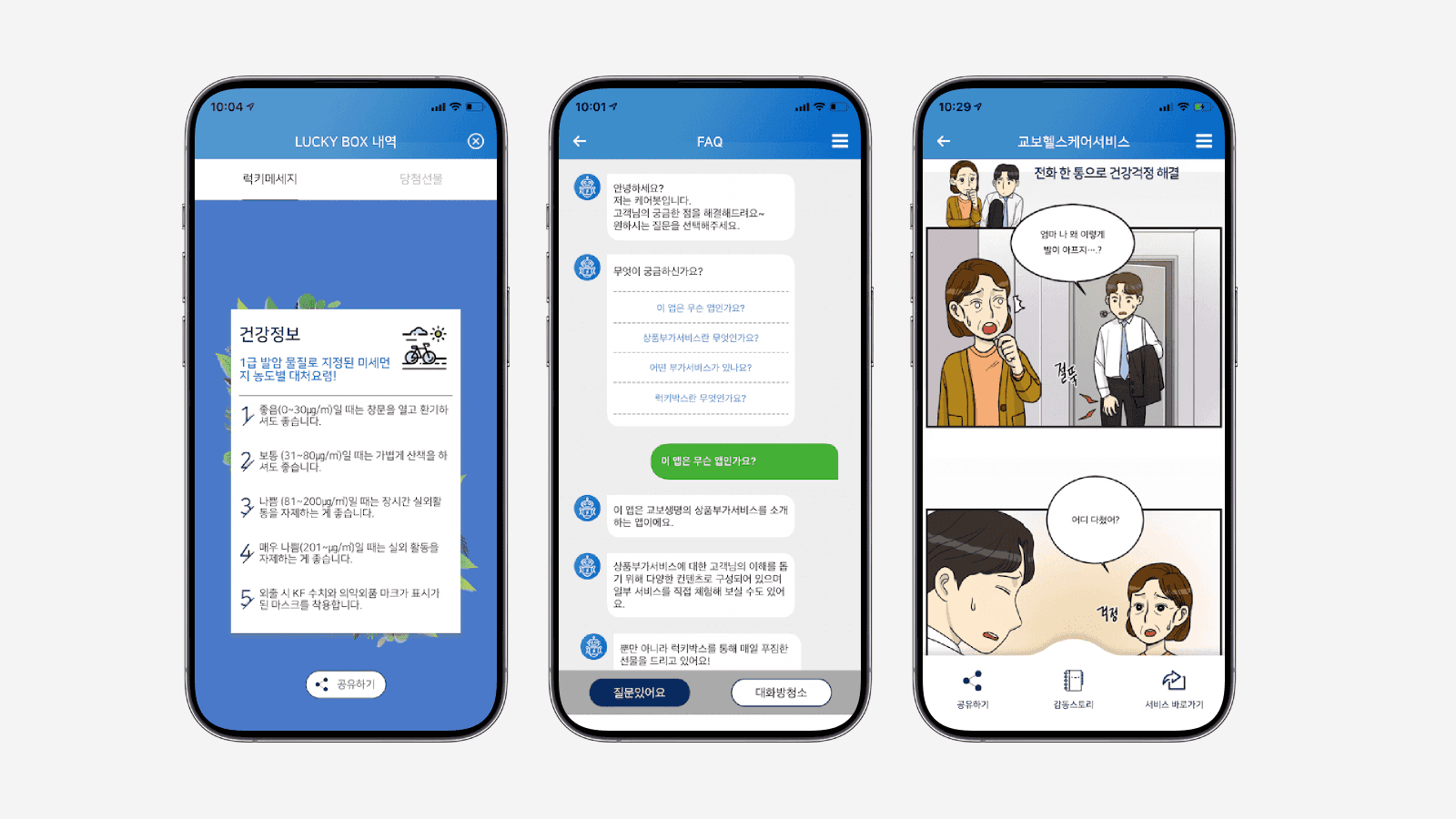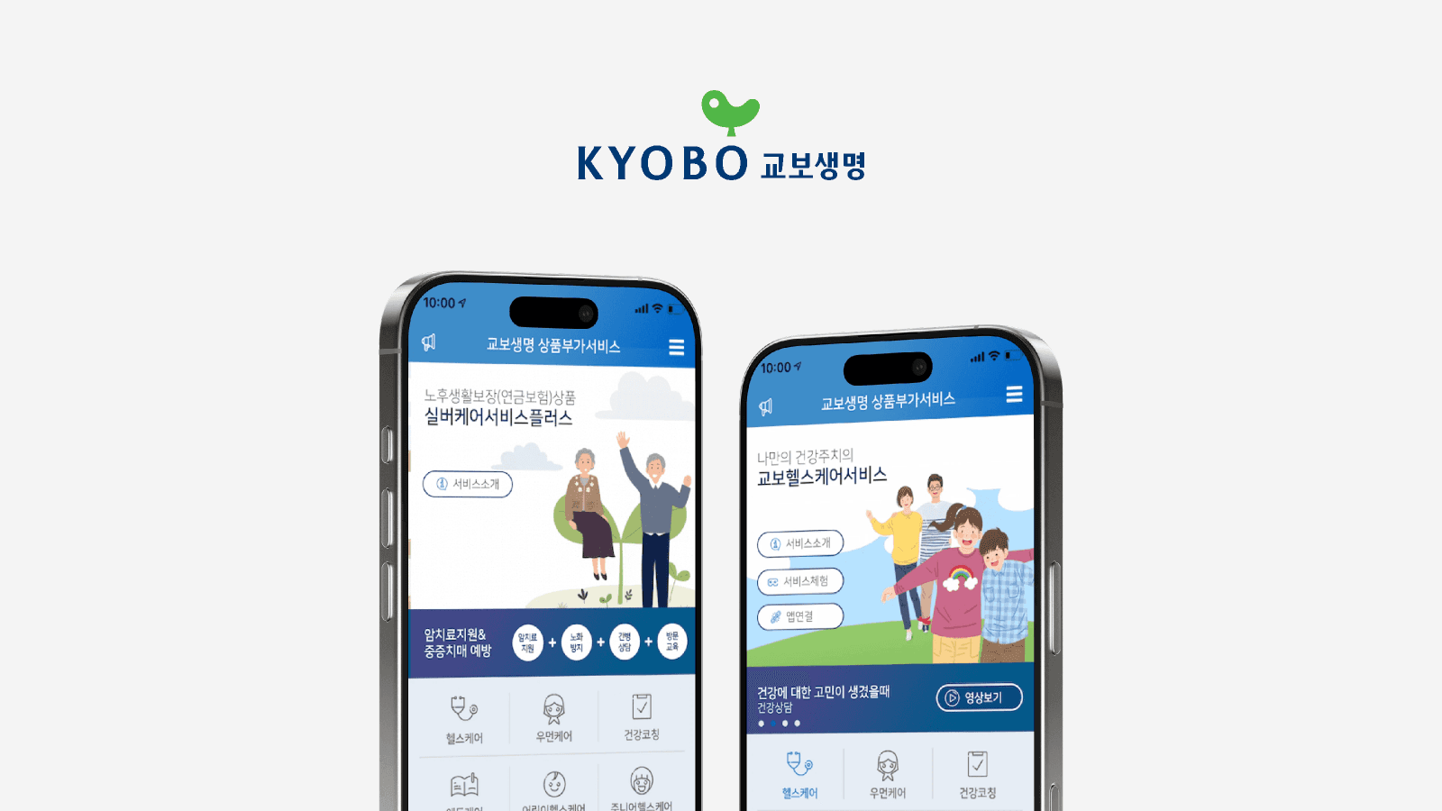 교보생명 상품부가서비스 앱에서 제공되는 주요 사용자 대상 기능입니다. 서비스 제공 및 탐색 총 8개의 상품부가서비스를 제공합니다. 서비스에 대한 동영상 및 카툰 등 다양한 콘텐츠를 제공합니다. 햄버거 메뉴(Drawer)를 통해 서비스 목록을 제공하며, 여기에는 헬스케어, 우먼헬스케어, 건강코칭, 실버케어 플러스, 치매케어, 에듀케어, 어린이헬스케어, 주니어 헬스케어 등이 포함됩니다. 앱 실행 후 런치페이지 이후 인트로 화면을 스와이프로 넘길 수 있습니다. '안내장'을 통해 서비스 소개 화면을 제공하며, 공유 버튼 기능이 있습니다. 이벤트 및 참여 매일 럭키박스 및 이벤트 참여 기능을 제공합니다. 메인 화면에서 이벤트 팝업을 표시합니다. 이벤트 참여 시 개인정보 동의 등 약관 내용을 웹뷰로 확인할 수 있습니다. 당첨자 발표 탭에서 나의 당첨 여부를 확인할 수 있습니다. 헬스케어 및 정보의 교보헬스케어서비스 Basic을 제공합니다. 금주의 키워드를 통해 건강상담 순위를 확인할 수 있습니다. 설정 및 개인정보 푸시 알림 설정(예: 럭키박스, 알리미) 기능이 있으며, 텍스트가 간결하게 수정되었습니다. 내 정보 확인 및 변경 기능이 제공되며, 레이블 표출(예: 여/10대 이하 자녀)이 상세화되었습니다.
