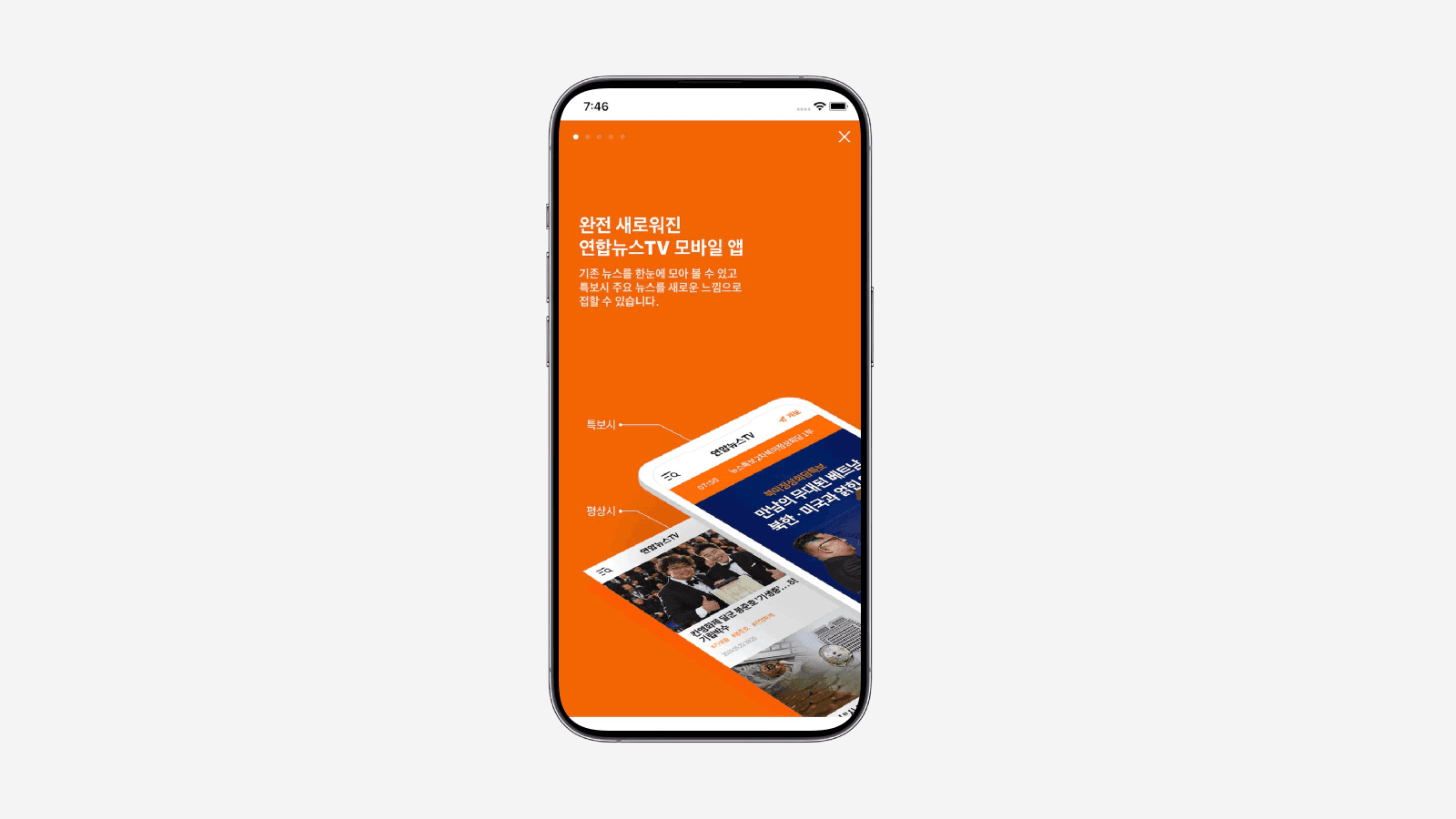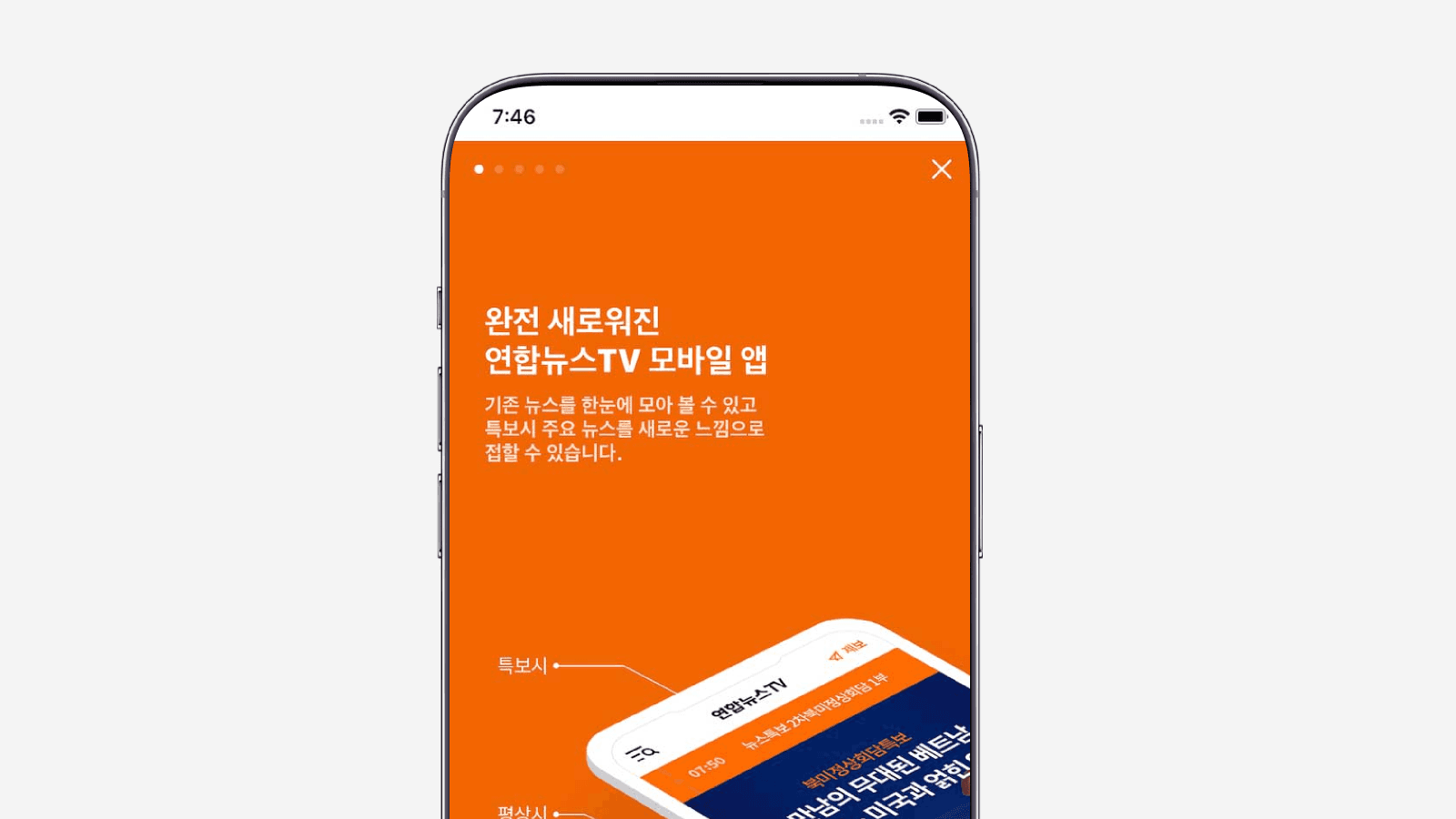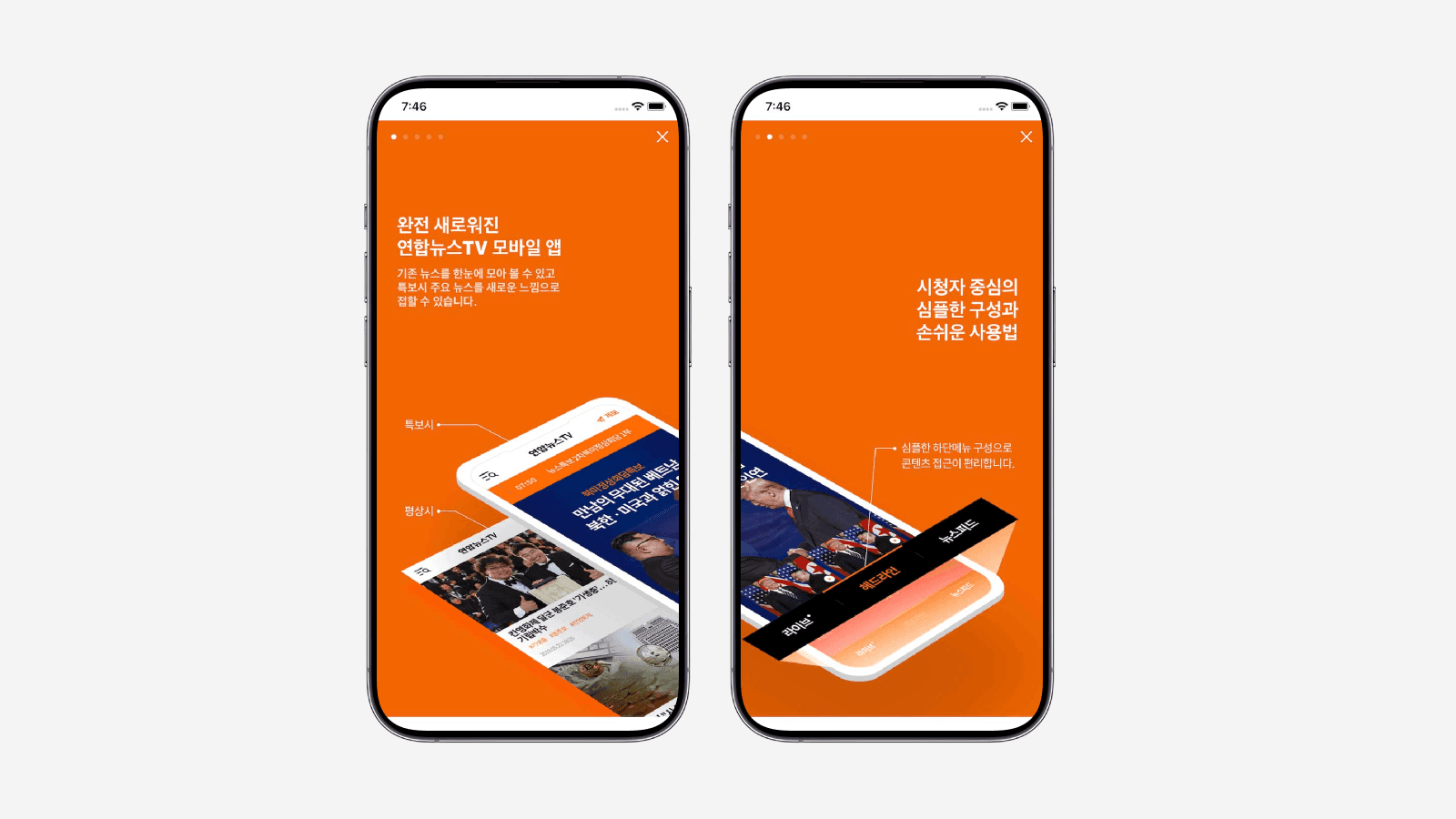 연합뉴스TV 모바일 앱은 네이티브 앱과 모바일 웹(WebView)을 연동하여 다양한 사용자 기능을 제공합니다. • 기본 콘텐츠 및 알림 : 뉴스 콘텐츠 및 제보 서비스를 제공하며, 사용자는 푸시 알림 수신 및 설정을 제어할 수 있습니다. 개인화 설정 (웹뷰 처리) * 다크모드(나이트모드) * 글자 크기 조절 * 북마크 기능 * 기사 공유 기능 (카카오톡 공유 기능 오류 개선 요청이 있었음) * LTE/3G/5G 사용 설정 기능 영상 및 화면 제어 * 상단 영상 고정 기능과 메인 스와이프 기능을 추가했습니다. * 라이브 페이지 및 기사 상세 페이지에서 영상을 풀화면으로 노출합니다(가로 전환 시). * 풀화면 상태에서 디바이스 취소 버튼을 클릭해도 가로 모드를 유지해야 합니다. 앱 제어 : 앱 메인 화면에서 디바이스 뒤로 가기 버튼을 터치하면 "앱을 종료하시겠습니까?" 팝업 창이 노출되며, 해당 화면에서 다시 백 버튼을 눌러도 화면이 사라지지 않도록 요청되었습니다. • 기술 구현 및 인터페이스 상세 앱은 iOS 및 Android 네이티브로 개발되었으며, 웹뷰와의 데이터 연동을 기반으로 합니다. A. 아키텍처 및 도메인 * 미디어 플레이어 : 라이브 재생에는 YouTube 플레이어가, 기사 페이지 영상 재생에는 위캔디오 플레이어가 사용됩니다. B. 앱-서버 통신 및 인증 * 푸시 등록 API * 전송 파라미터 (App → Server): 푸시 수신 여부(`pn`, Y/N), 단말 식별값(`dk`, Native에 영구 보관), 푸시 식별값(`pk`, 토큰), 플랫폼(`pf`, ios 또는 android). * 쿠키 저장: 서버 응답이 성공(`result: ok`)일 경우, 암호화된 토큰을 쿠키로 웹뷰에 등록합니다 C. 네이티브-웹뷰 인터페이스 (Native Interface) 푸시 수신 여부 설정 (Web → Native) * (Native → Web): 웹뷰에 푸시 수신 여부(`hasReceiveYn`)와 푸시 토큰(`token`)을 전달하기 위해